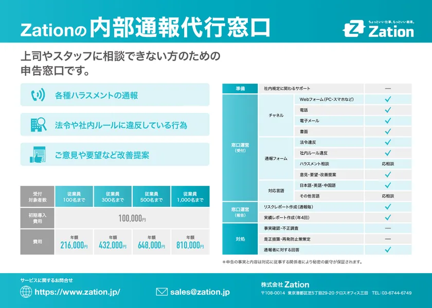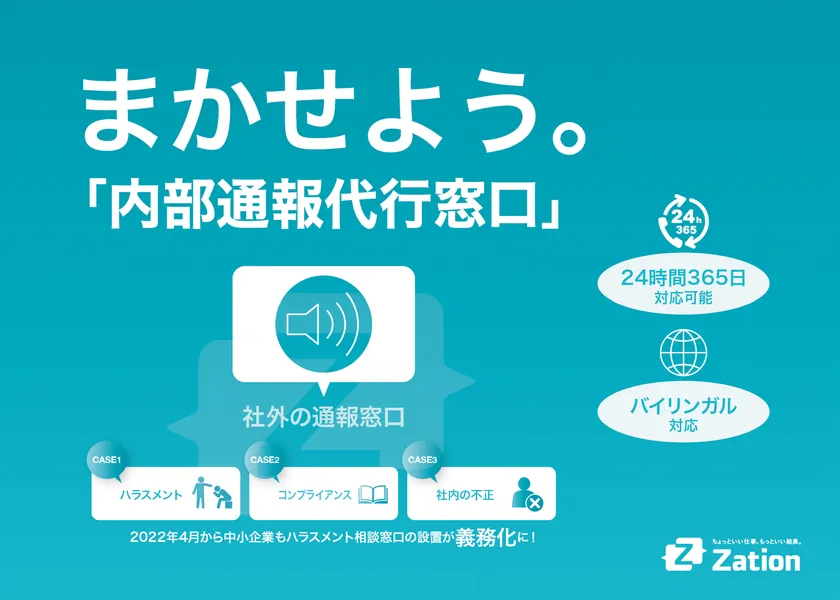 BPO・コールセンター事業を中心に、19年間にわたり日米でBPOサービスを展開している株式会社Zation(所在地:東京都港区、代表取締役:田村 佳則)は、弁護士・社会保険労務士と連携し、従業員からの法令違反や社内規定違反の申告やハラスメント相談、メンタル相談までを企業に代わって受付する新たなサービスメニューとして、“まかせよう。「内部通報窓口」”をリリースいたしました。