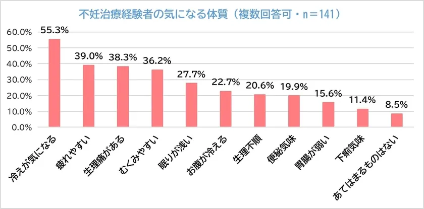 不妊治療の経験者に「気になる体質」を聞いたところ、最も多かった回答は「冷え」(55.3%)、次いで、「疲れやすい」(39.0%)、「生理痛がある」(38.3%)、「むくみやすい」(36.2%)、「眠りが浅い」(27.7%)となりました。特に、冷え性は不妊の原因になりやすいとも言われている(※1)ため、妊活中の方は早めの改善が必要と考えられます。