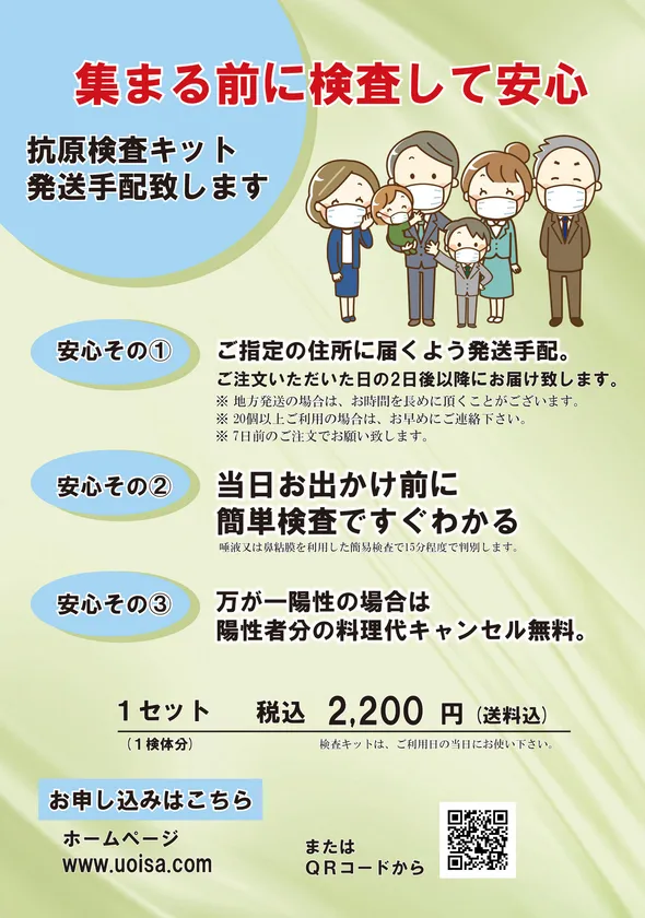 創業80年、冠婚葬祭仕出し専門店の魚伊三株式会社(本社:東京都練馬区、代表:小美濃 友一)は、コロナ禍でも安心して式を行いたいという声が多い事から、業界初となる抗原検査キット付きサービスを12月1日から開始します。