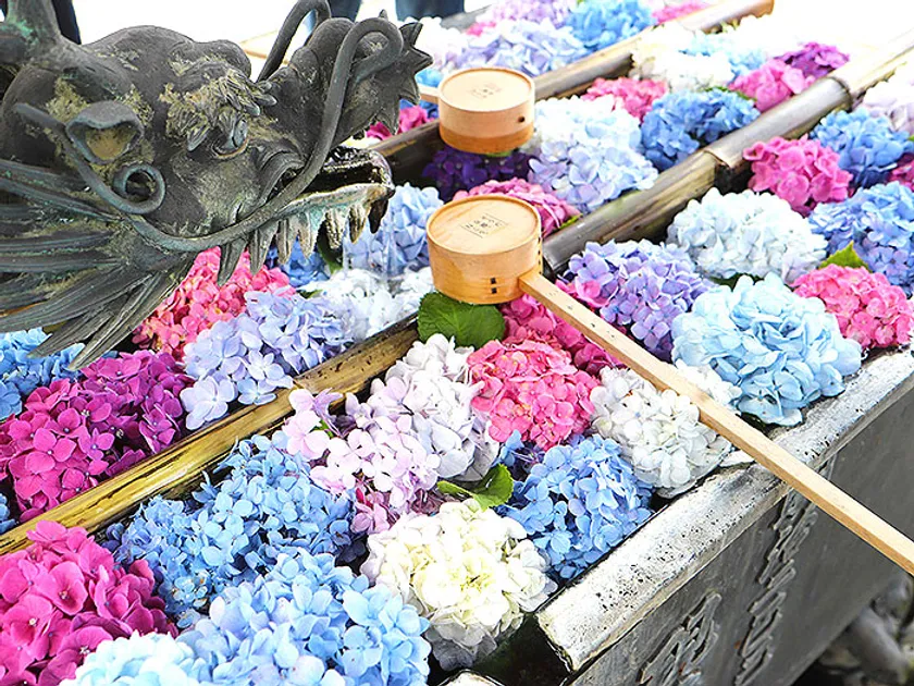 お参りをする前に手や口を清める水を手水(ちょうず)と言い、手水や手水鉢に敷き詰められた草花の様子を花手水(はなちょうず)と言います。その花手水を日本で一番最初に始めたのが長岡京市です。今では全国に広がった花手水ですが、2017年に柳谷観音 楊谷寺が手水舎にあじさいを浮かべたことが始まりでした。