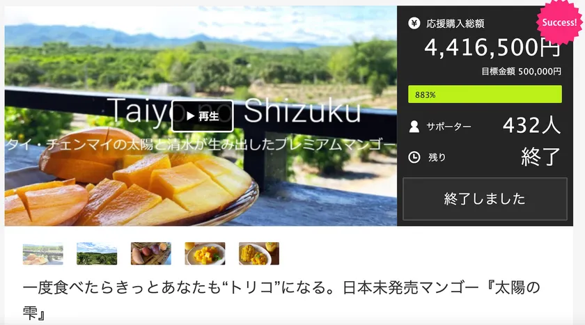 日本人の金子さんがタイに渡り、30年の歳月をかけて作り上げた金子農園のプレミアムマンゴーが、応援購入サービスMakuakeにて880%達成し、432名の方から応援購入を頂きました。