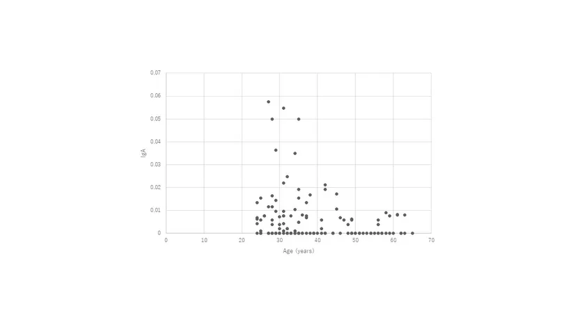 図説明:24-49歳と50-65歳の2群に分けて解析すると有意差(p = 0.008)があり、若い世代に多く高齢者に少ない。