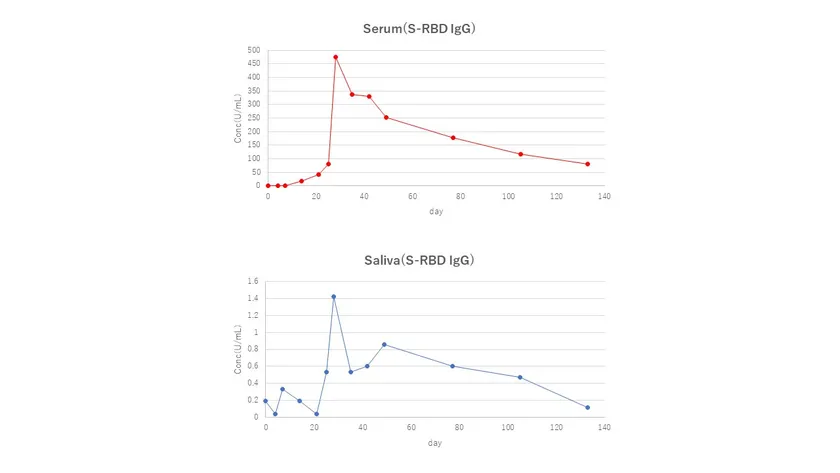 図説明:ファイザー社の新型コロナウイルスに対するワクチン後の血清と唾液を用いてIgG中和抗体を経時的に調べた(N=1,富士フィルム和光純薬社製Anti SARS-CoV-2 S-RBD IgG ELISA kit)。血清(上段)と唾液(下段)のIgG中和抗体は相関が認められた。