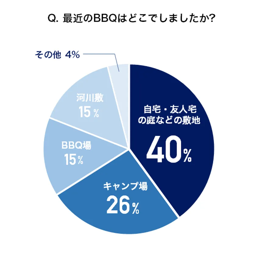 [ 自宅(友人宅)の庭などの敷地 40% / キャンプ場 26% / BBQ場 15% / 河川敷 15% / その他 4% ]