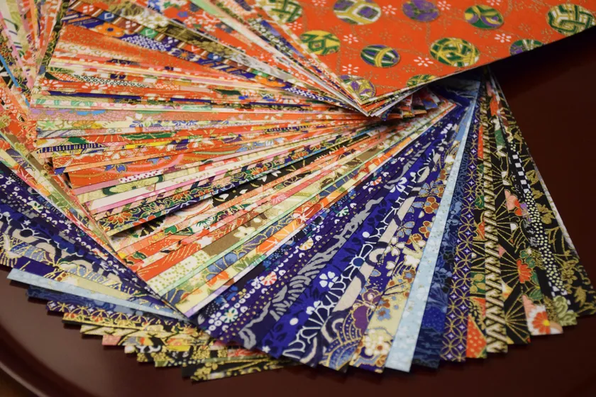 今回選んだ千代紙は、全国有数の和紙産地として生産が続く福井県越前市の「越前和紙」を使った、着物の友禅染のような優雅で華麗な「友禅千代紙」です。ふんわりとした手ざわりに、粋だったり可愛かったり渋かったり、数千種類から厳選された美しい柄がシルクスクリーンで刷られています。