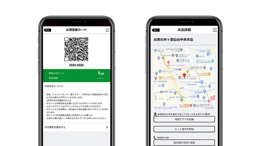 本アプリは、日本茶/甘味を中心に提供する『お茶の井ヶ田』『喜久水庵』『茶寮kikusui』などお茶の井ヶ田運営の全店舗で共通の会員向けアプリです。会員証機能を搭載し、従来の紙のポイントカードで貯めたポイントの移行にも対応しています。店舗でのお会計金額100円(税込)ごとに3ポイントが付与され、貯まったポイントは1ポイント=1円として次回以降利用できる仕組みです。また、アプリから手軽にオンラインショップを利用することができ、今後店舗とのポイント連携を予定しています。