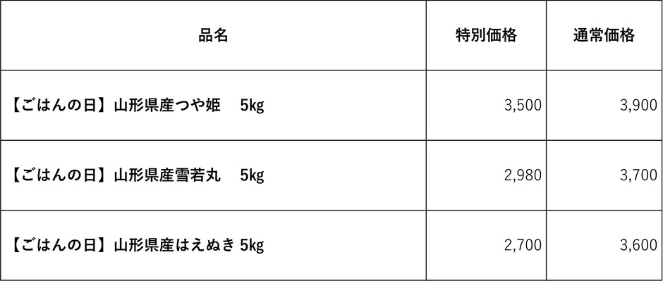 このイベントは、「小さなYAMAGATAマルシェ」が独自で制定した“にこにこ「ごはんの日」”に限り、対象の山形県産のお米を最大25%の割引価格で販売するイベントです。お米を通常よりもお得に・気軽にネットショップで購入していただき、消費拡大をはかるのが狙いです。山形県の主要3品種のお米「つや姫」「雪若丸」「はえぬき」が対象となり、「つや姫」は外観・食味・香り全てが高水準のお米、「雪若丸」は粘りと硬さが新食感のお米、「はえぬき」は食べ飽きないバランスがとれたお米です。