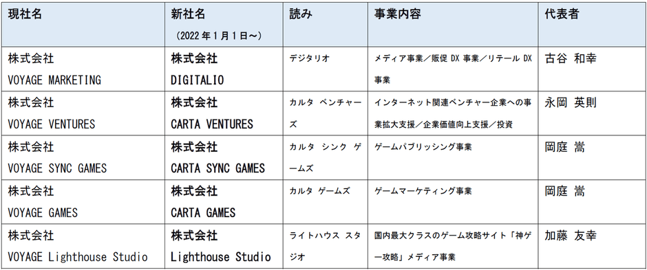 株式会社CARTA HOLDINGSのグループ会社である株式会社VOYAGE GROUP(東京都渋谷区、代表取締役社長兼CEO:宇佐美 進典、以下「VOYAGE GROUP」)は、事業子会社の「VOYAGE MARKETING」「VOYAGE VENTURES」「VOYAGE SYNC GAMES」「VOYAGE GAMES」「VOYAGE Lighthouse Studio」各5社の社名を2022年1月1日より変更いたします。