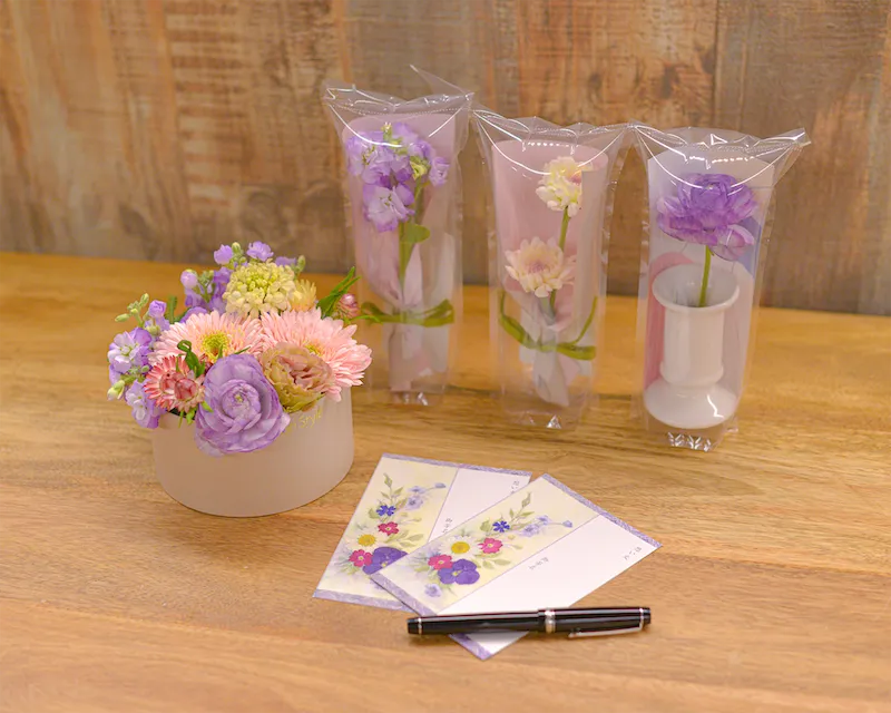斎場に設置する「花の自動販売機」で「フォーエバーフラワー」を提供することによって、故人と親しかったにも関わらず、出棺時の花入れの儀式など、直接故人の見送りに立ち会えない方でも、斎場の受付や参列されている親族の方にお預けいただくことで、最期のお別れとして花とメッセージを添えることが叶います。また、喪主の意向で大きな供花や香典を辞退されている場合でも、一輪の花や押し花のメッセージカードで、故人への感謝の気持ちを形にしていただくことができます。花びん付きの「より添いフラワー」は、参列者が自身で購入し自宅にお持ち帰りいただくだけでなく、喪主から会葬お礼として参列者にお渡ししていただくこともでき、毎年その季節の花を見ると故人との日々を思い出し、いつまでも故人が寄り添ってくれるかのような気持ちになることができます。