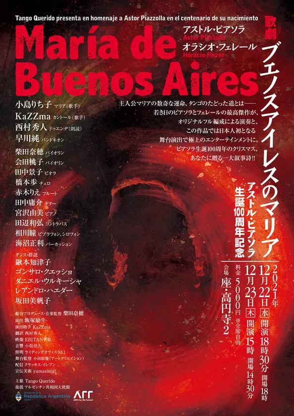 Tango Querido [タンゴケリード]【人格なき社団法人 所在地:東京都練馬区・代表:柴田 奈穂(バイオリン奏者)】が、2021年12月22日(水)と23日(木)の2日間、座・高円寺2【所在地:杉並区高円寺】にて、アジアで初めての上演となるアストル・ピアソラ(作曲)とオラシオ・フェレール(作詩)の歌劇「ブエノスアイレスのマリア」公演を原語上演・字幕付きで行います。(コンサート形式での演奏は過去にありました。演劇的な要素を加えての公演がアジアで初めてとなります。)