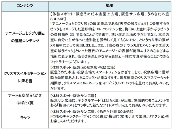 阪急うめだ本店をはじめとした梅田エリアに設ける4か所の体験スポットで、専用アプリ「XRシティ」をダウンロードした体験者自身のスマートフォンをかざすと、スポットごとに「アニメージュとジブリ展との連動コンテンツ」「クリスマスイルミネーションに降る雪」「アート&空間らくがき:はばたく翼」「キャラ」のXRコンテンツをそれぞれお楽しみいただくことができます。各コンテンツの概要についてはイベント概要をご参照ください。