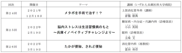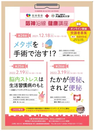 今年度(第24~26回)は、初のオンライン講座として、2022年春開業予定の「大阪梅田ツインタワーズ・サウス」に同年秋開設する「兵庫医科大学 梅田健康医学クリニック」でも受診可能なメタボ、便秘、生活習慣病といった「身近な病気」をテーマに、兵庫医科大学病院の医師が詳しく解説します。