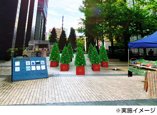 西梅田地区のオフィスワーカーから集めた「西梅田で働くみんなとやってみたいこと」を記したハート型のオーナメントを飾ったクリスマスツリーを展示。12月6日(月)~10日(金) と12月13日(月)~17日(金) の平日は、キッチンカーやマルシェも出店します!