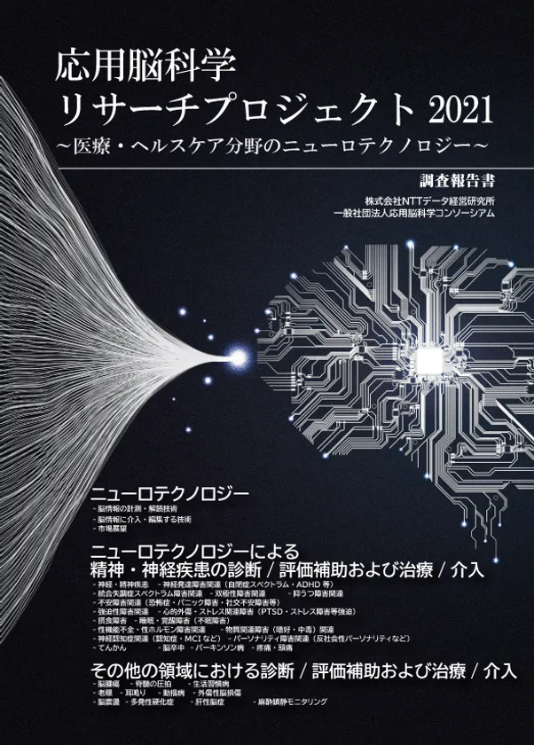 株式会社NTTデータ経営研究所(本社:東京都千代田区、代表取締役社長:柳 圭一郎、以下 NTTデータ経営研究所)および、一般社団法人応用脳科学コンソーシアム(代表理事・会長:柳田 敏雄、代表理事・理事長:岩本 敏男、所在地:東京都千代田区、以下 応用脳科学コンソーシアム)は、目まぐるしく進化を続ける脳科学とその応用動向について調査を行い「応用脳科学リサーチプロジェクト2021 医療・ヘルスケア分野のニューロテクノロジー」としてとりまとめ、このたび発表いたしました。