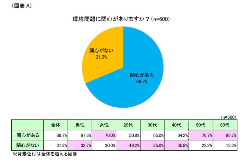 環境問題に関心があるか調査したところ、「関心がある」(回答率68.7%)が「関心がない」(同31.3%)を大きく上回り、約7割が環境問題に「関心がある」ことがわかりました。