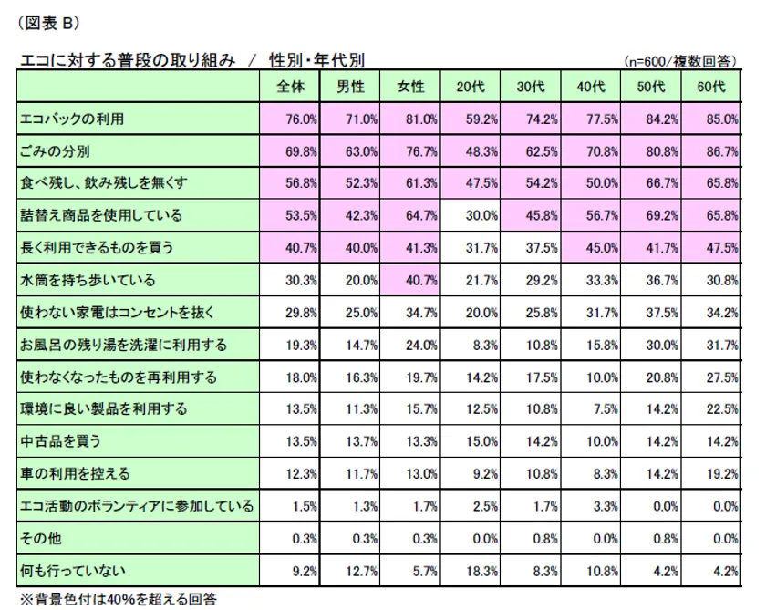 年代別でみると、過半数が取り組んでいる項目として、20代は「エコバックの利用」のみに留まる一方で、40代以上では「ごみの分別」、「食べ残し、飲み残しを無くす」、「詰替え商品を利用している」の計4項目において過半数が取り組んでおり、高齢世代ほどエコに対して積極的な取り組み姿勢であることが表れています。(図表B)