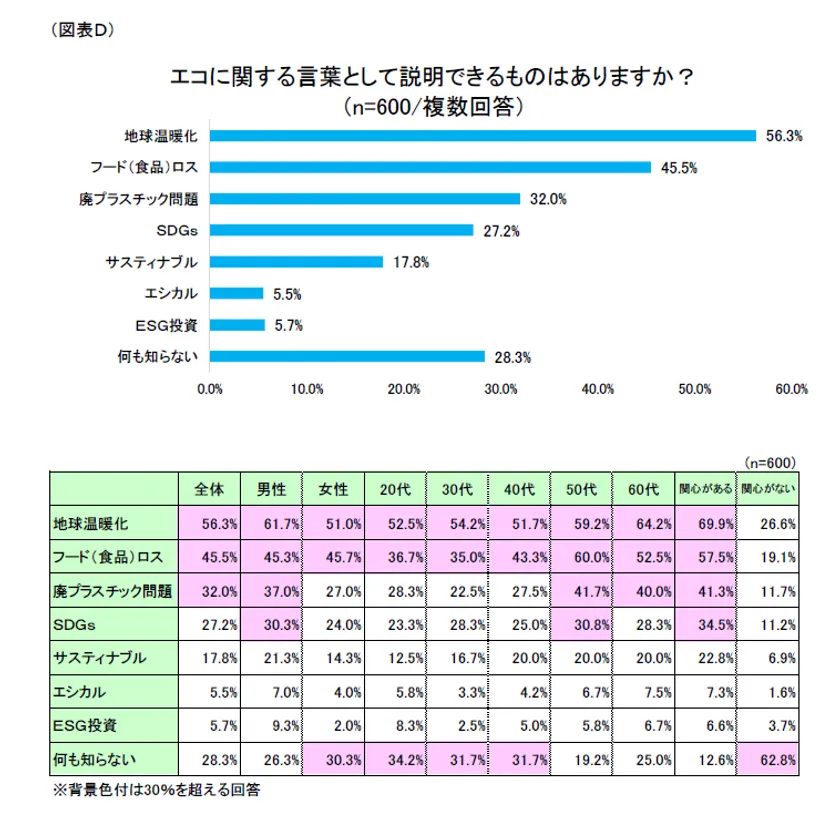 エコに関する言葉の理解度について調査したところ、1位は「地球温暖化」(回答率56.3%)、2位「フード(食品)ロス」(同45.5%)、3位「廃プラスチック問題」(同32.0%)となりました。