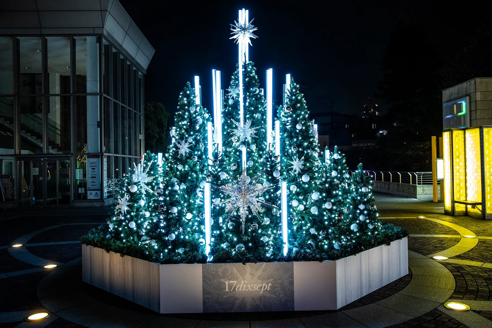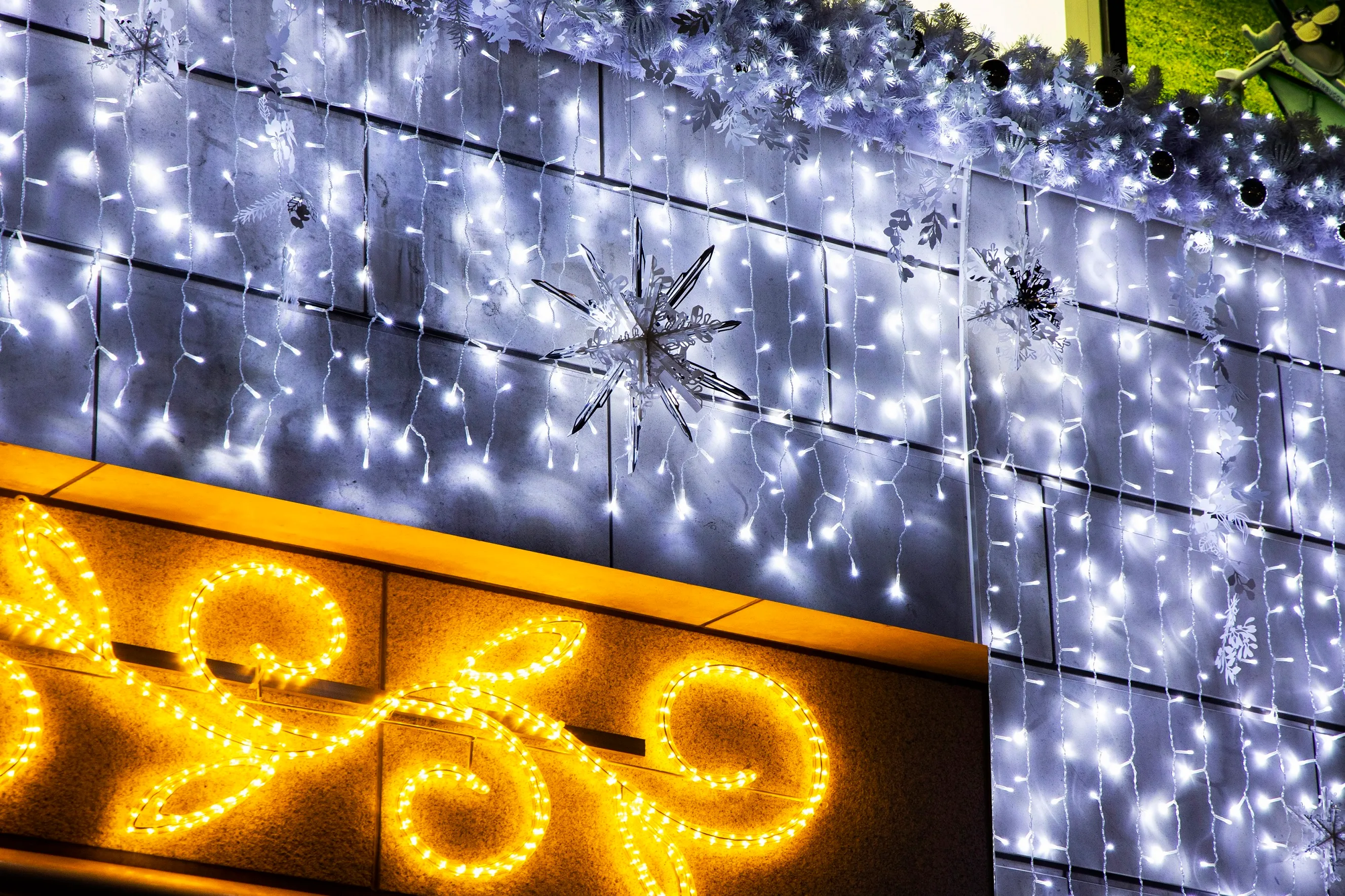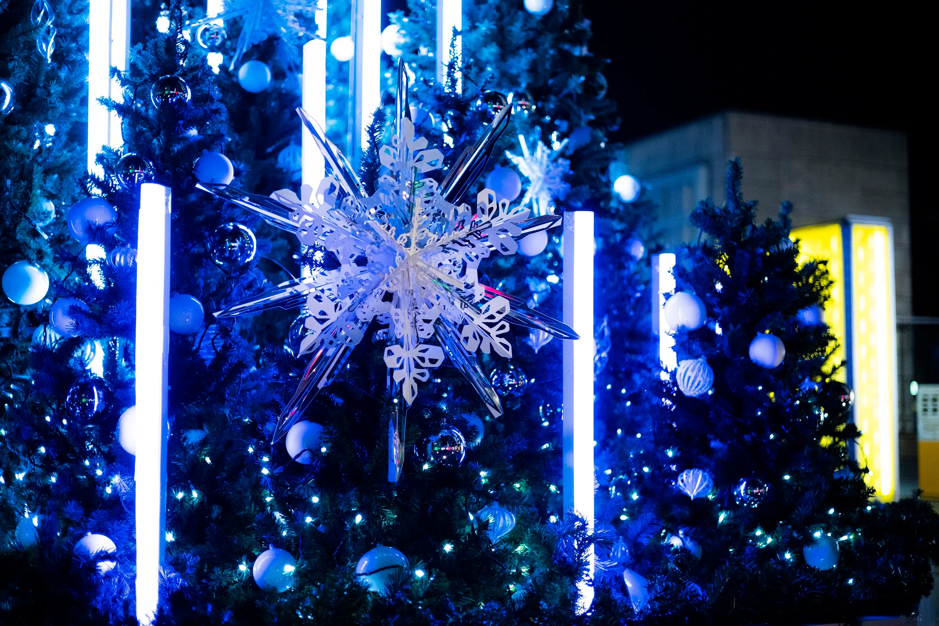 白とネオンのライトを使用し、華やかさを演出しています。30秒毎に色変わりする演出は約40パターンあり飽きさせない装飾となっています。