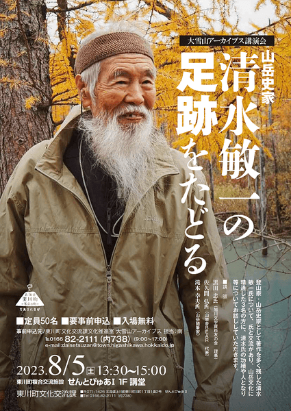 北海道東川町は、大雪山文化を伝えるために設立された「大雪山アーカイブス」の専門員であった清水敏一氏の追悼講演会を、8月5日(土)にせんとぴゅあⅠ 講堂にて開催いたします。