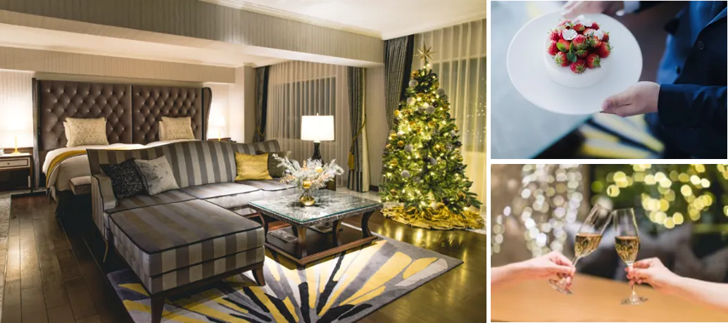 クリスマスケーキ&ボトルシャンパンのルームサービス付・館内もクリスマス装飾を実施中