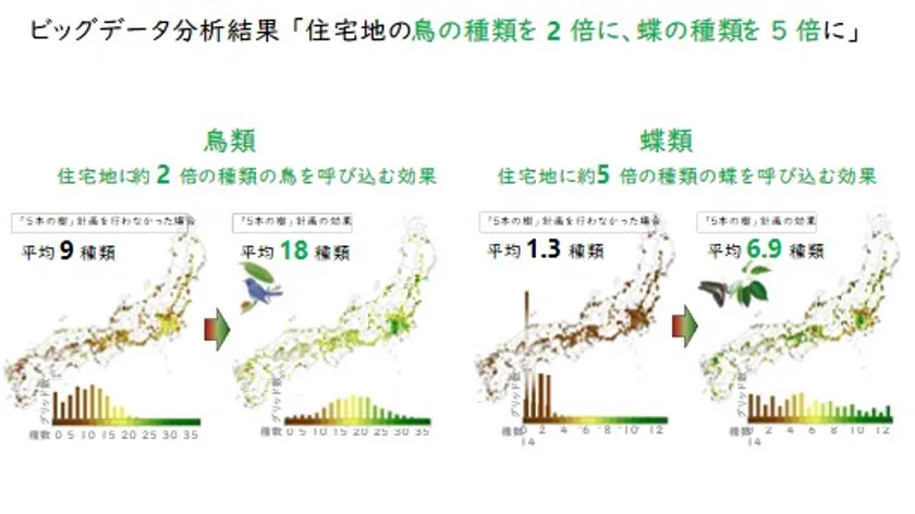 この定量評価により、生物多様性の劣化が著しい都市部(三大都市圏)において、園芸品種や外来樹種などの従来の庭木と比べて「5本の樹」計画に沿った在来樹種を中心に庭木を選定して植樹してきたことで、以下の生物多様性の効果が確認出来ました。(*4)