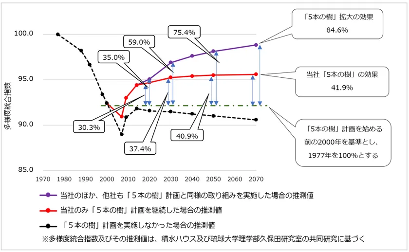 この在来樹種による取り組みが当社だけでなく、今後日本で新築される物件の30%について「5 本の樹」計画が採用された場合、その回復効果は84.6%まで上昇するという予測ができています。