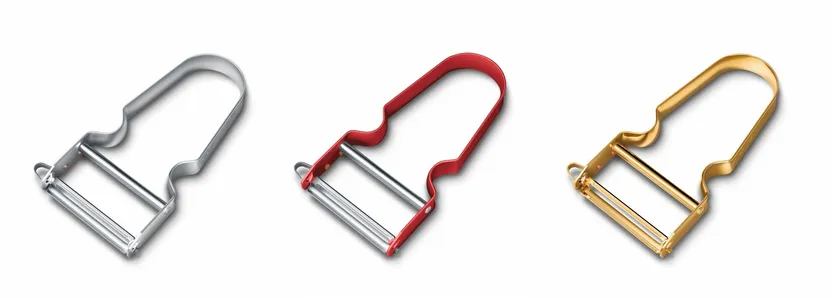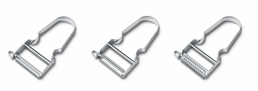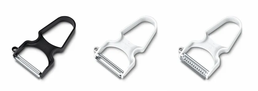 また、ハンドルの素材の違いだけでなく、刃の種類でも見分けることができます。「REX」は切れ味の良いストレートのみ、「STAR」はストレート・ダブルエッジ、波刃、千切りの3種類。「RAPID」には、ストレート、波刃、千切りの3種類のピーラーが用意されています。さらに、すべてのピーラーは、果物や野菜の皮の下にあるビタミンを維持するために非常に薄く皮をむくので、食材に含まれるビタミンを逃しません。ビクトリノックスのピーラーシリーズは、アマチュアからプロの料理人まで、素早く効率的に作業をしたい方に最適なパートナーです。