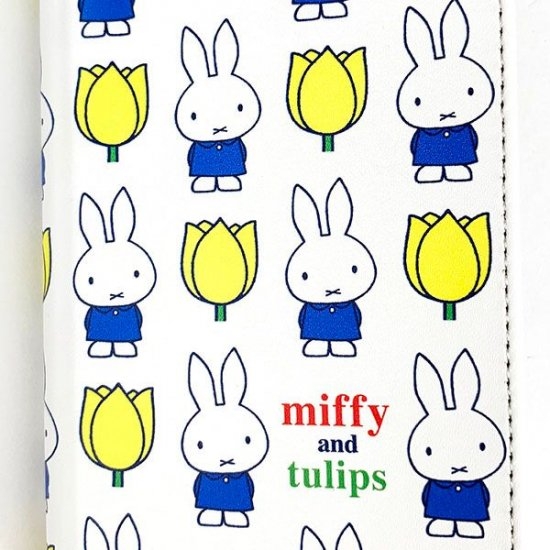 デザインをアップで確認してみましょう!ホワイトカラーにイエローのチューリップとネイビーのお洋服がよく映えますね♪ちょっと首をかしげたミッフィも可愛い~♡