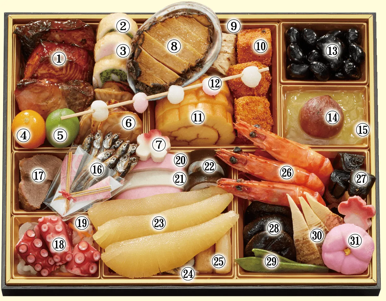 11.伊達巻 12.もち玉すだれ