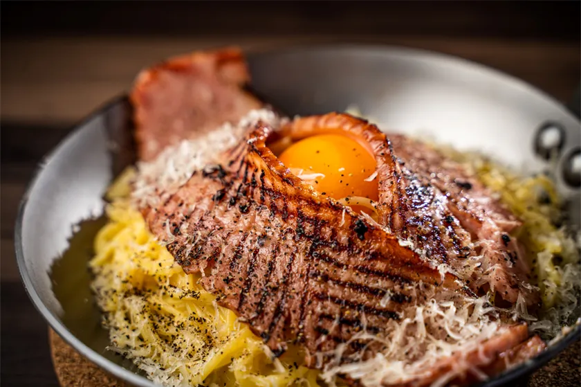 大判のベーコンをふんだんに使用し、豪快にかぶりついて食べるカルボナーラ