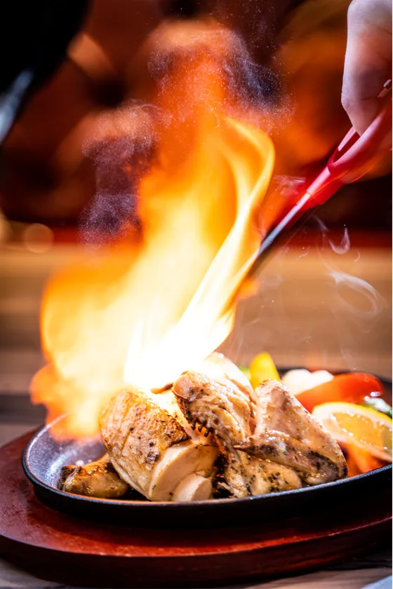 ロティサリーチキン最後の仕上げのフランベで風味も格別