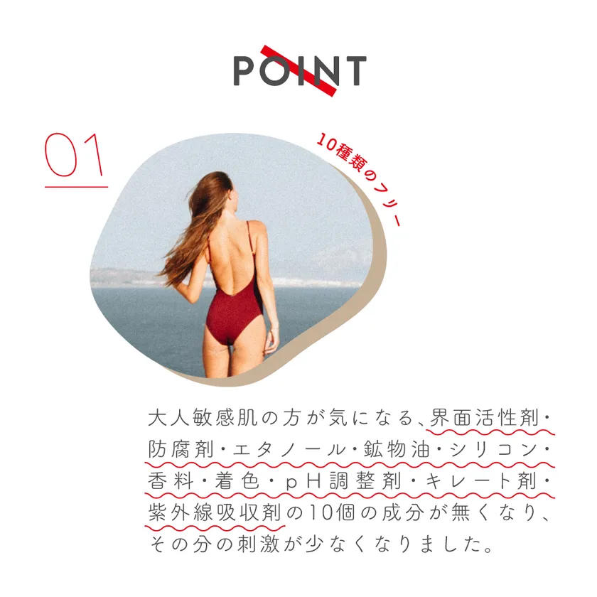 大人敏感肌の方が気になる、界面活性剤・防腐剤・エタノール・鉱物油・シリコン・香料・着色・pH調整剤・キレート剤・紫外線吸収剤の10個の成分が無くなり、その分の刺激が少なくなりました。