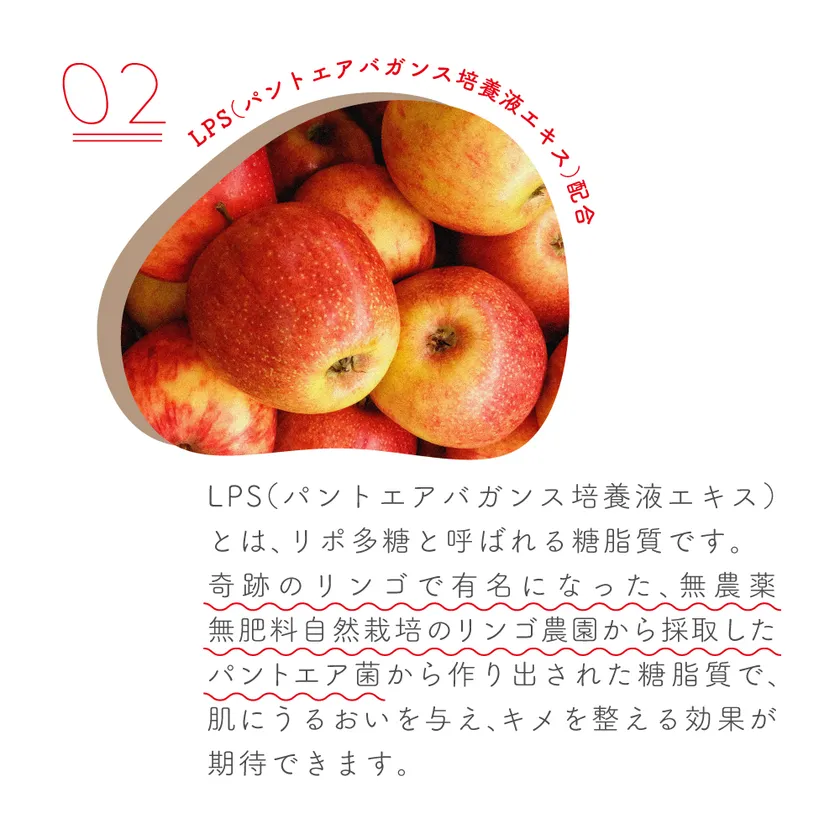 奇跡のリンゴで有名になった、無農薬無肥料自然栽培のリンゴ農園から採取したパントエア菌から作り出された糖脂質で、肌にうるおいを与え、キメを整える効果が期待できます。