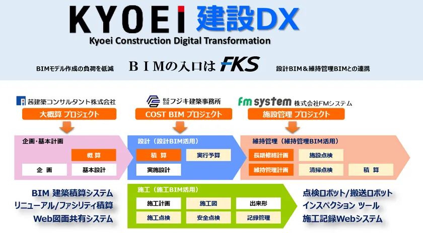 あわせて2021年12月6日(月)から8日(水)まで、東京ビッグサイトで開催される「第1回 建設DX展」に出展いたします。本展示会では、新プロジェクトの発表と、『BIMの入口はFKS』をキーワードに、BIMモデル作成の負荷軽減につながる建築積算システム「FKS」をはじめ、Web図面共有システム、施工記録システム、現場カメラ、自動走行型点検ロボットまで、当社が進める「建設DX」をご紹介いたします。