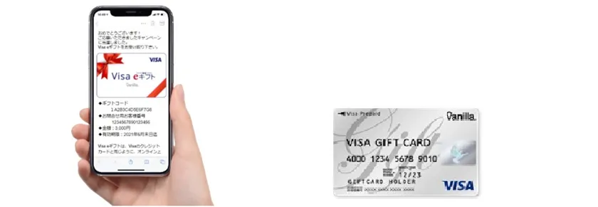 Visaのギフト「Visaギフトvanilla」は、Visa加盟店で使えるVisaのプリペイドギフトです。デジタルギフトの「Visa eギフト」とギフトカードの「バニラVisaギフトカード」の二種類があります。どちらもクレジットカードと同じようにご利用いただけます。(Visa eギフトは、オンライン専用です)。Visaブランドならではの圧倒的利用先と購入金額が自由に設定できる柔軟性が高く評価され、国内の大手・中小様々な企業にてキャンペーン景品やインセンティブとしての採用実績があります。