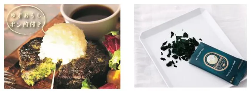 (左)美の王様ハンバーグ、(右)生スピルリナを製品化した「タベルモ」