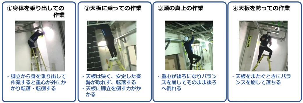 脚立作業において、危険状態とされるものとして(図1)のような例がありますが、実際の作業内容を撮影した映像をAI解析エンジンにかけ、これらの危険状態の検出可否について検証を行うとともに、検出状況を画面(ビューア)上に表示する仕組みの開発・検証を行いました。
