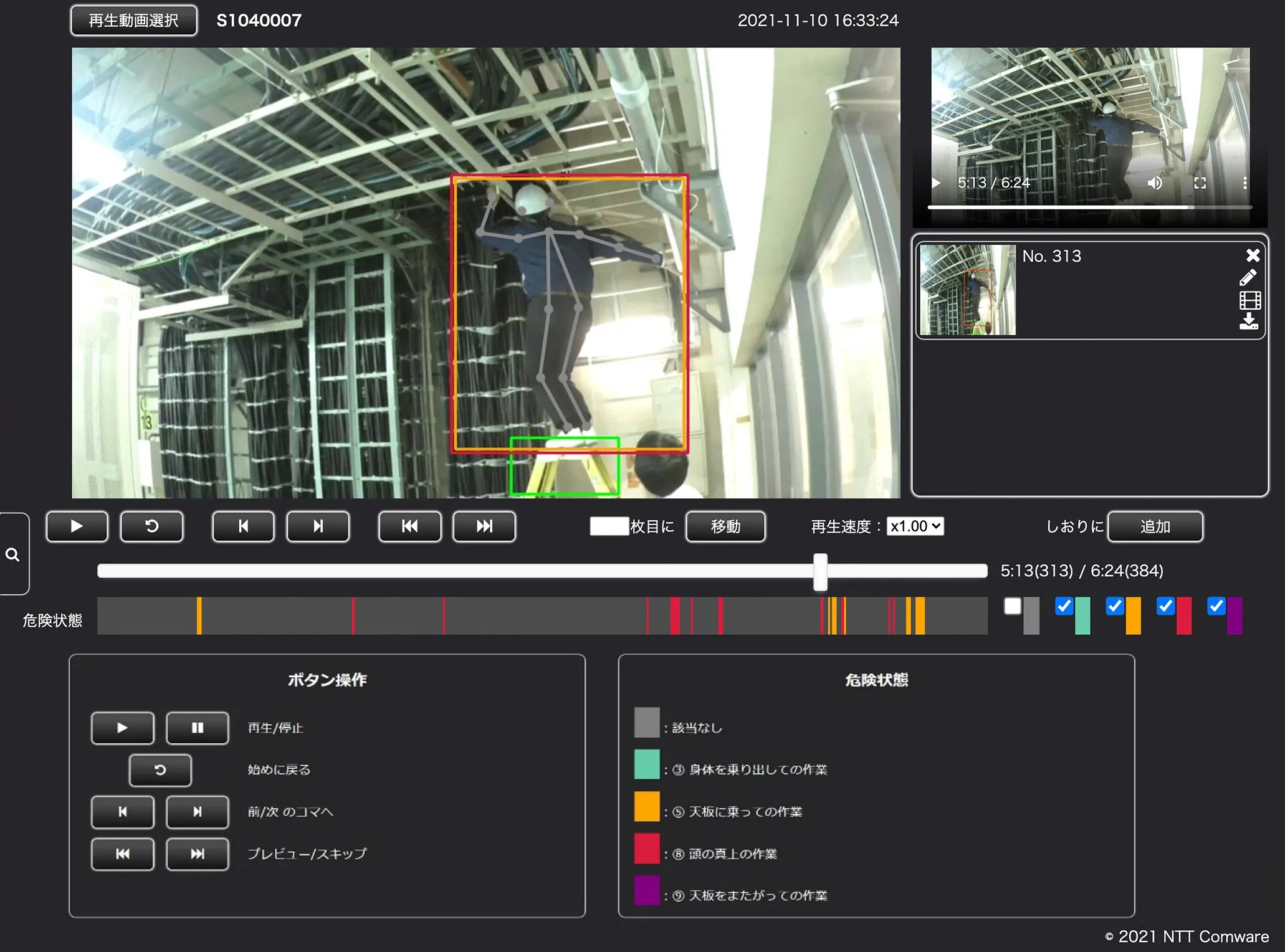 AIが危険状態を検出した時間帯を色の帯で表示し、種別ごとにスキップ再生しながら効率的に確認でき、注意喚起のコメント入れやズーム表示が可能