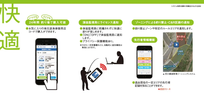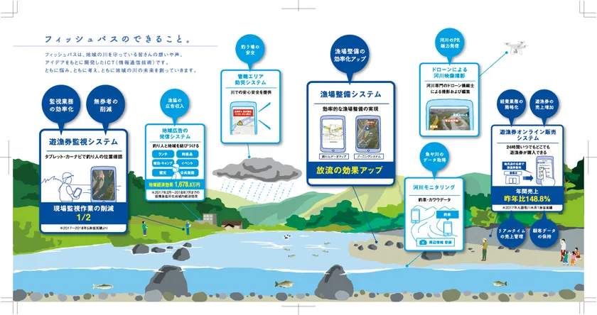 フィッシュパスはスマートフォンで遊漁券の購入及び決済を行うことができるアプリであり、提携漁協数は業界トップの地位を築いています。また、川釣りの定番アプリとして、10万人超のユーザーからご支持をいただいています。このフィッシュパスの利用により、漁協の遊漁券販売や管理業務の負担が軽減されることに加え、釣り人からもその利便性が評価されて遊漁券の販売量が増加し、収益が大幅に改善した漁協実績があります。他にも釣り人に対し、川での防災、観光情報の通知サービスを展開しています。