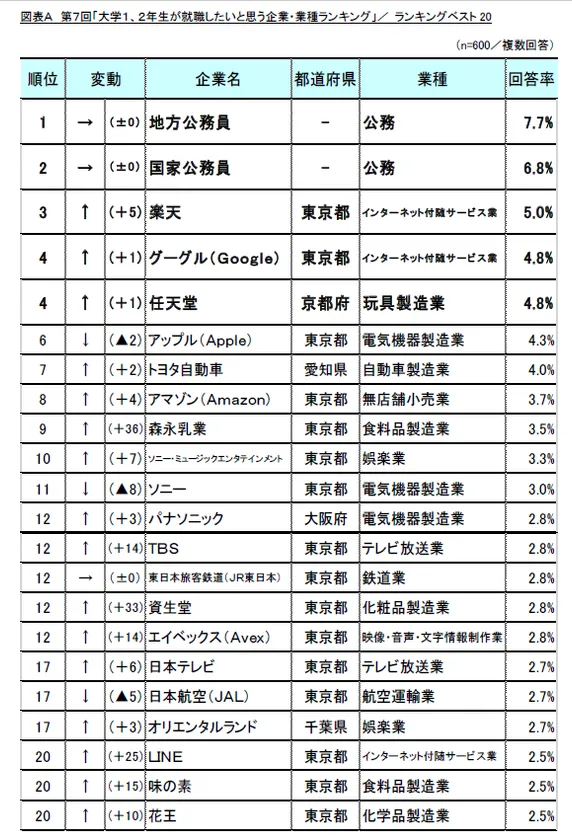 「大学1、2年生が就職したいと思う企業・業種ランキング」のランキング1位は「地方公務員」(回答率7.7%)でした。次いで「国家公務員」が2位(同6.8%)、「楽天」が3位(同5.0%)となり、以下4位「グーグル(Google)」、「任天堂」(各同4.8%)、6位「アップル(Apple)」(同4.3%)、7位「トヨタ自動車」(同4.0%)、8位「アマゾン(Amazon)」(同3.7%)と続きました。