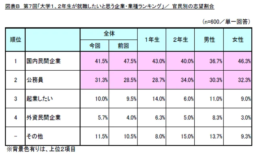官民別の就職先の志望割合としては、「国内民間企業」(前回 47.5%→今回 41.5%)への就職を志望する割合が低下し、調査以来最低水準となりました。(図表B)