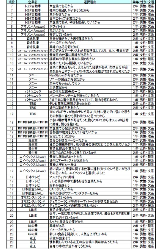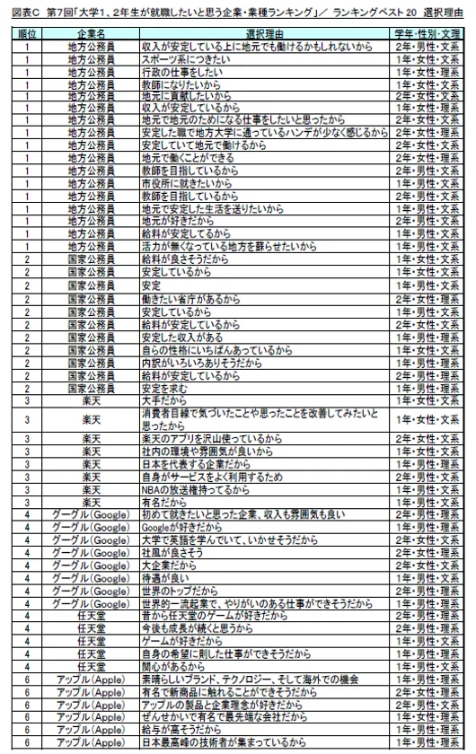 民間企業では、「楽天」、「Google」など身近なインターネットサービスを提供する企業や、「任天堂」、「アップル(Apple)」といった、日常的に使われる電子端末の製造企業が上位にランクインしています。これらの企業を選択した理由として、当該企業の製品、サービスが好きだからと言った回答が多くみられ、「身近に感じる企業」と「就職したい企業」がリンクしていることがうかがえます。
