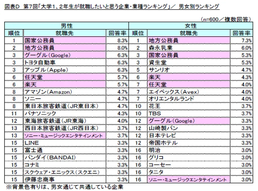 就職先として望む企業を男女別に集計したところ、男性が望む就職先は、前回9位の「国家公務員」(同8.3%)が大きく順位を上げて第2回調査時以来1位となり、2位「地方公務員」(同8.0%)3位、「グーグル(Google)」、「トヨタ自動車」、「アップル(Apple)」(同6.3%)と続きました。このほか、女性では上位にランクインしていない「東日本旅客鉄道(JR東日本)」、「東海旅客鉄道(JR東海)」、「西日本旅客鉄道(JR西日本)」のJR各社が人気を維持し、「任天堂」、「バンダイ(BANDAI)」、「コナミ」、「スクウェア・エニックス(スクエニ)」などゲーム開発会社が高い人気を得ています。