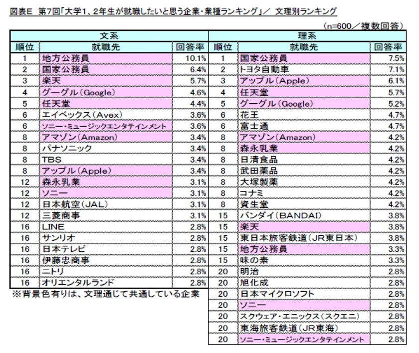 一方、理系が望む就職先ランキングは、「国家公務員」(回答率7.5%)が理系では初の1位となり、次いで2位が「トヨタ自動車」(同7.1%)、3位が「アップル(Apple)」(同6.1%)となりました。また、民間企業でトップ20にランクインした24社のうち製造業が17社と7割強を占めており、大学で学んでいる専門知識を活かして、開発や製造の現場で働きたいという志向がうかがえる結果となりました。(図表E)