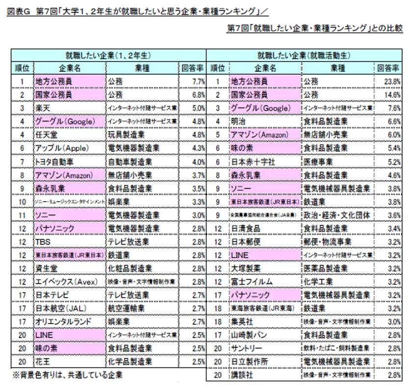 第7回「大学1、2年生が就職したいと思う 企業・業種ランキング」調査 ~身近に感じる企業がランクイン! 5年前比較では流行を反映した入れ替わりも~
