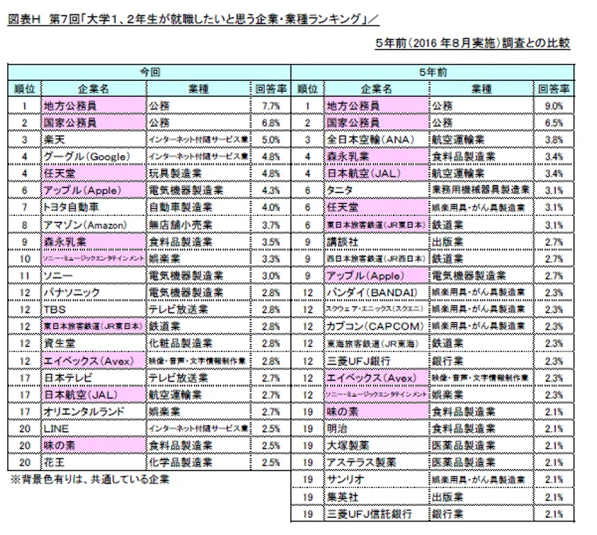 また、5年前の2016年8月に実施した「第2回、大学1、2年生が就職したいと思う企業・業種ランキング」と比較すると、トップ20における企業の重複は半分程度となりました。