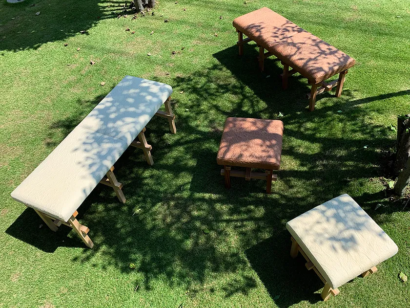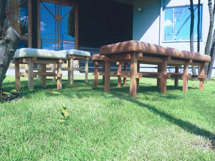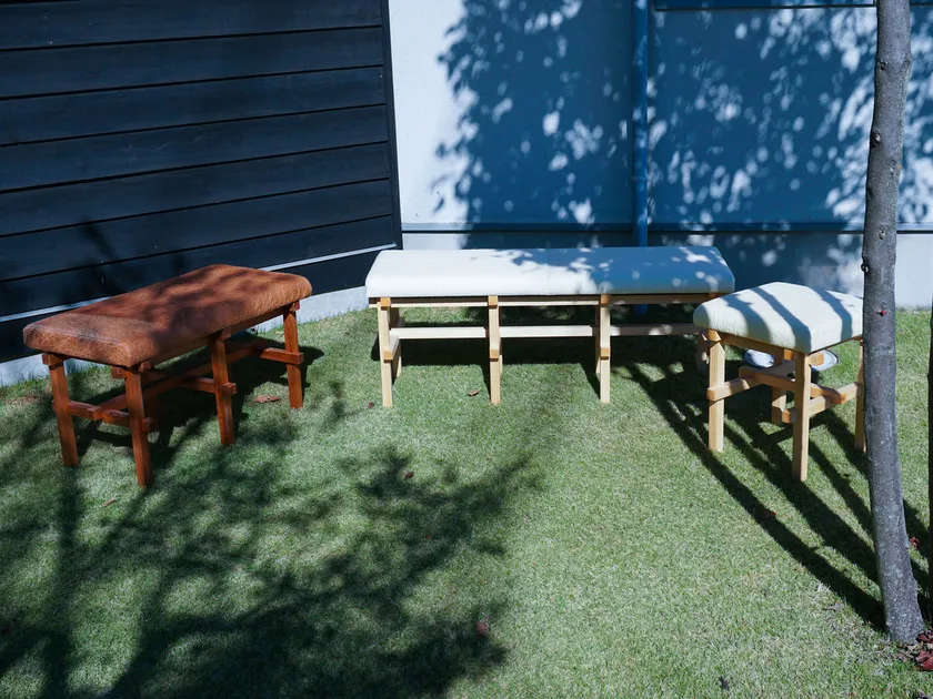 共通して、スツール型からベンチ型(大・小)のサイズ違いと[生成色/ヒノキ材]と[柿渋/スギ材]の組み合わせでそれぞれのタイプをご用意しました。