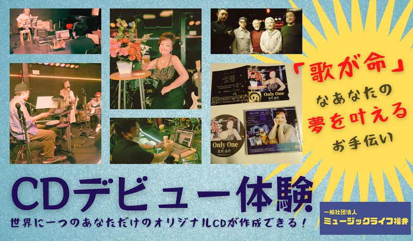 カラオケ愛好家のご婦人から、「自分が生バンドで歌ったCD作りたい!」と言われたことがきっかけで始まった、カラオケファンのためのCDデビュー体験。第一弾が大好評だったことを受け、続々レコーディングを希望する方が増えてまいりました。還暦や金婚式などの人生の節目の記念や、結婚式やイベントで流すためになど、今までハードルが高すぎたCDデビューのお手伝いをさせていただきます!