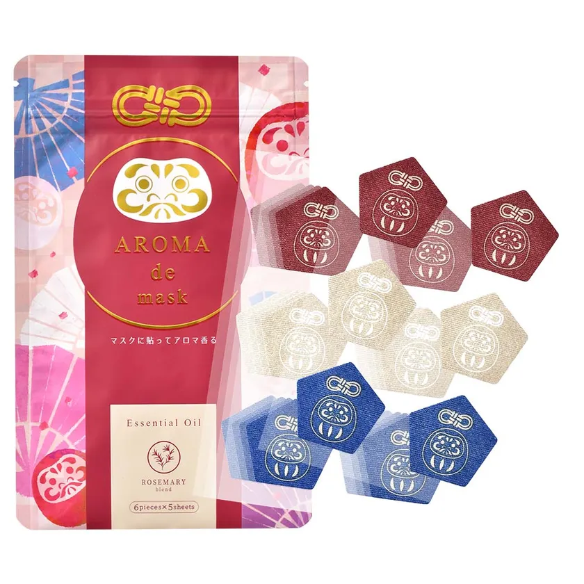 ダルマデザインのアロマdeマスクは、必勝ダルマが描かれた3色の五角形シールです。