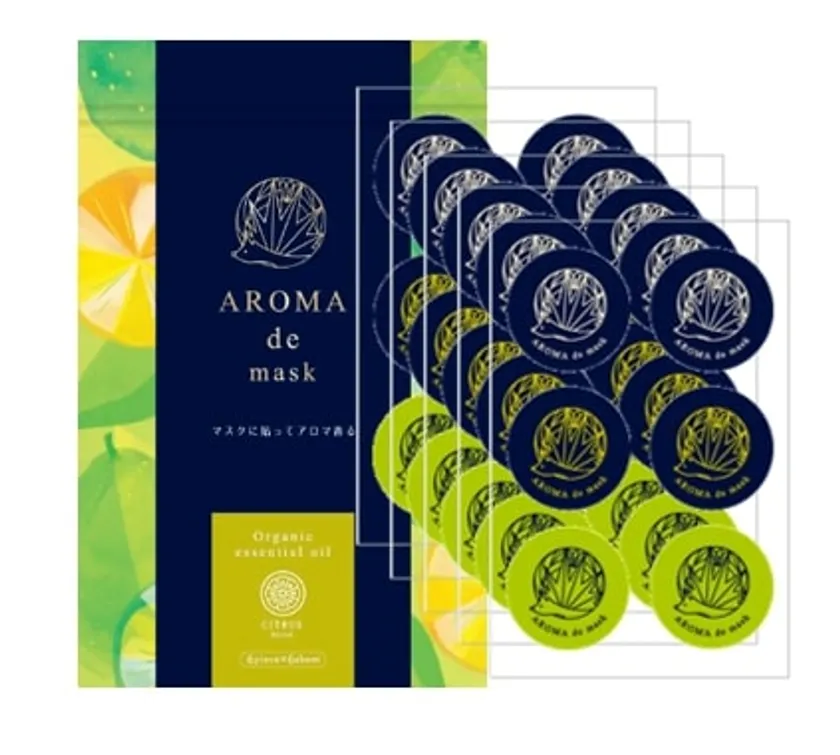 アロマdeマスクは、アロマオイルを滴下したシールをマスクに貼ることでマスクの不快感を解消する新ジャンル商品です。